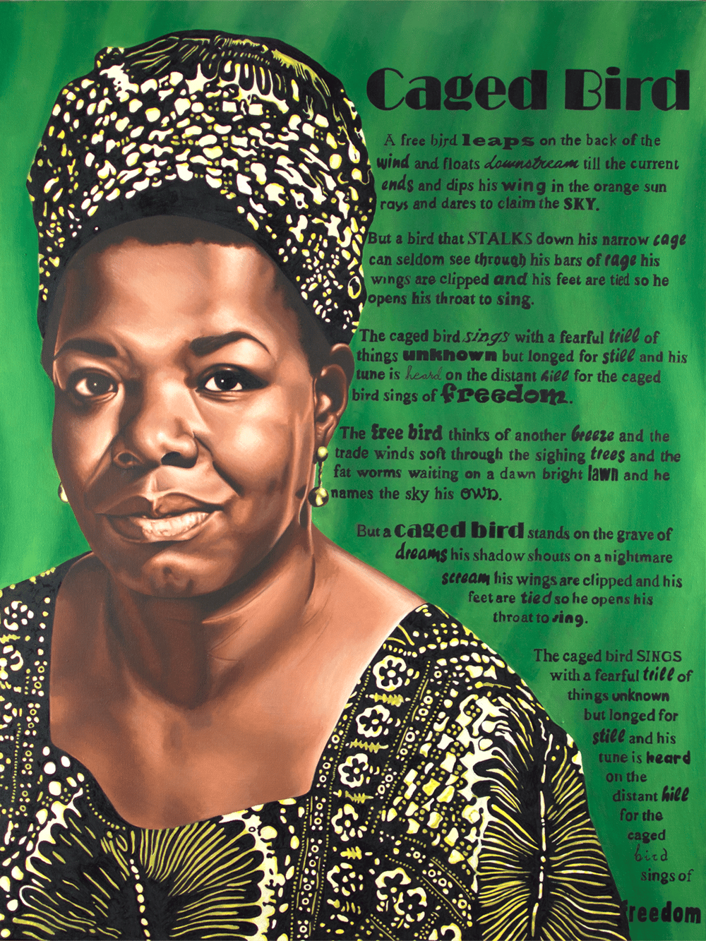 This print is part of a series of centered around black women authors. This is Maya Angelou with her poem caged bird.
